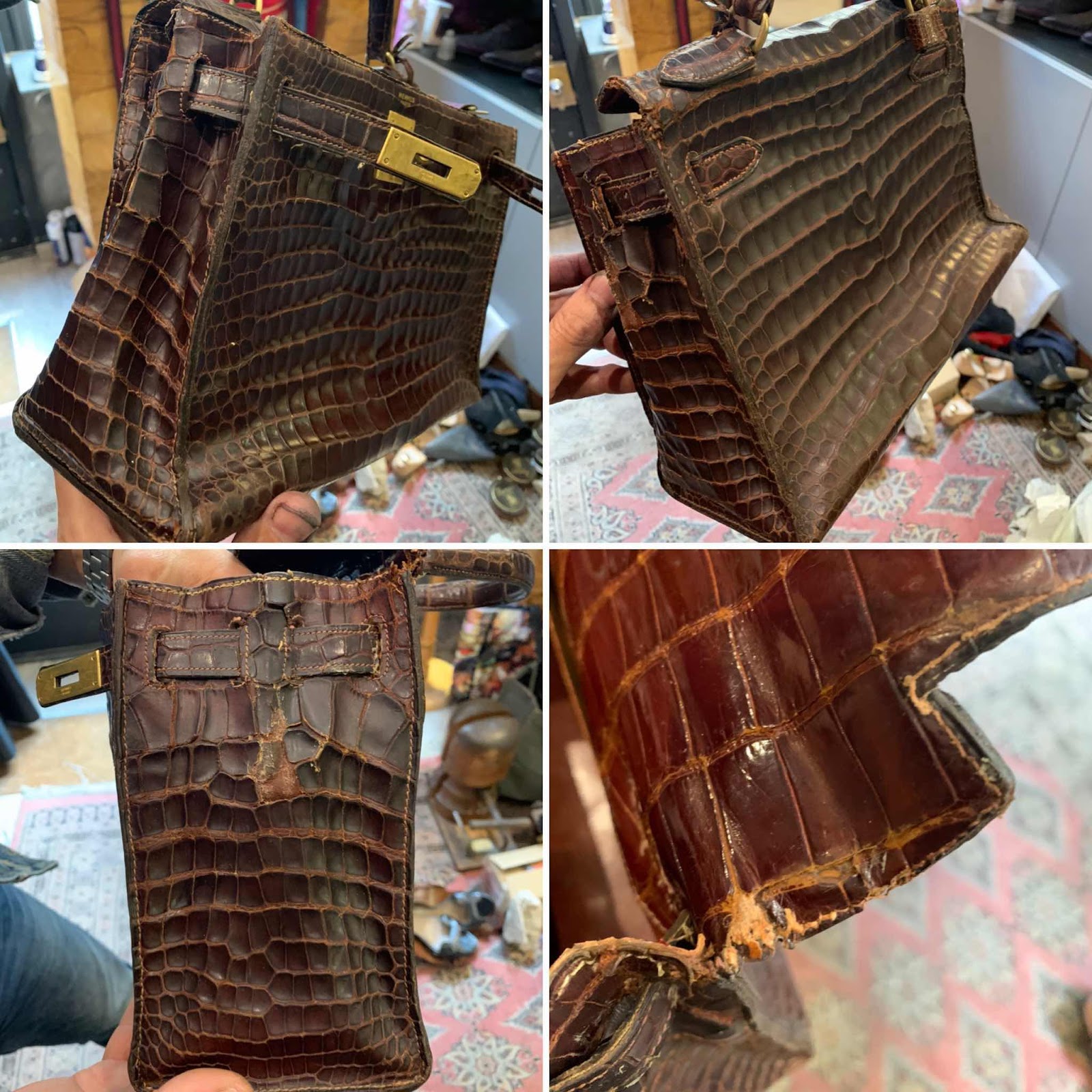 Franchement pas évident à rénover surtout en croco vintage car archi fragile et les coutures tiennent à peine... c’est vrai j’ai mis du temps pour arriver au bout de cette histoire... du mal à trouver une peau croco pour refaire les pans de deux côtés ... la anse et une bandoulière que la cliente souhaitait... en attendant ce sac importable et inutilisable est de nouveau opérationnel et à de la gueule n’est-ce pas ?!